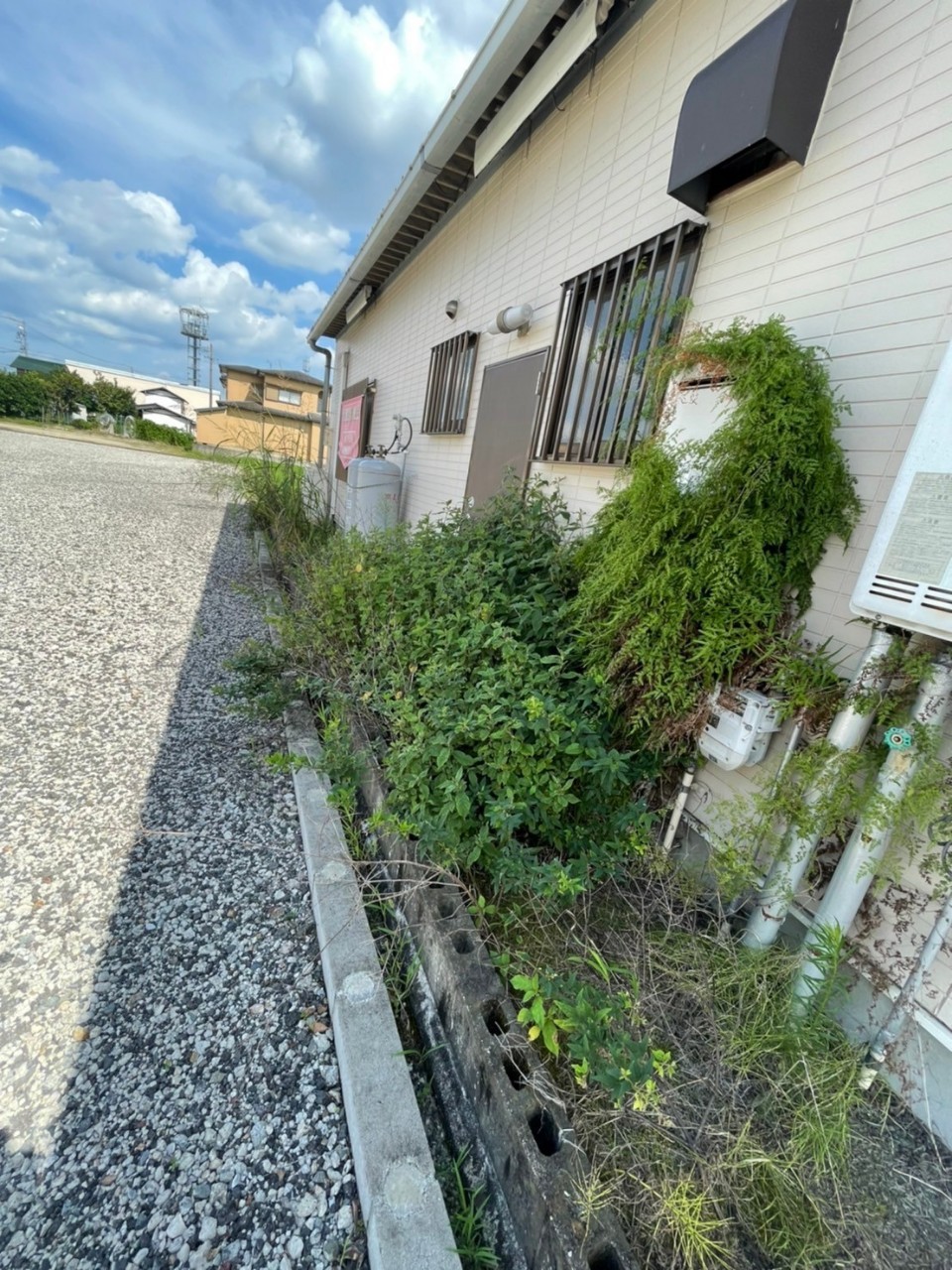 兵庫県 福崎町 にて、外壁設備に絡まっていた支障木の抜根と雑草